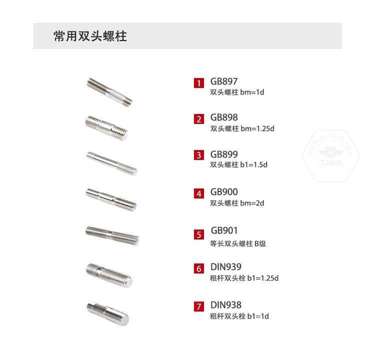 B級等長雙頭螺柱引用國家標準GB901-88,規定了螺紋直徑為M2-M56、B級的等長雙頭螺柱。