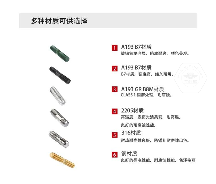 3、常用的雙頭螺柱材質:35鋼、45鋼、30CrMo、35CrMo、42CrMo、25Cr2MoV、660、304、316、304L、316L、B7、B7M、B16、B8、B8M、A320L7、2205/2507等材質。