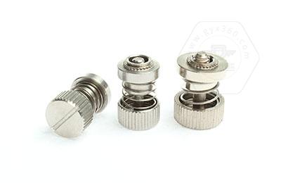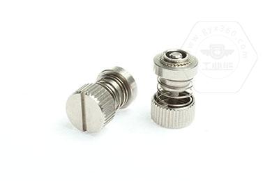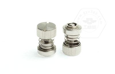 手緊螺釘的壓鉚套具有壓花齒,壓裝于于機箱或薄鈑孔內(注:薄板的鉆孔徑相對應彈簧螺釘的壓齒徑有一定要求的,形成一個外露的彈簧螺釘,用手擰另一端(即手擰端).因其里面固定有彈簧,螺釘相對于薄板的另一端來回進出。