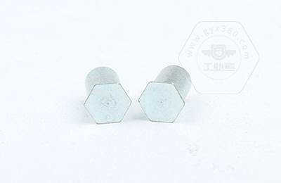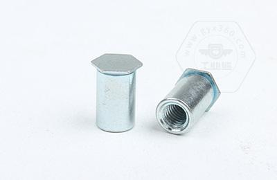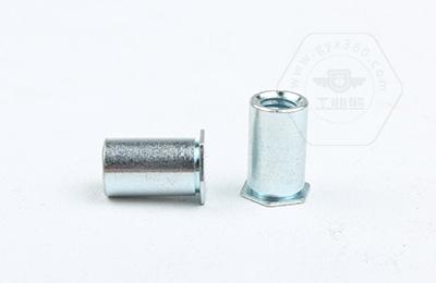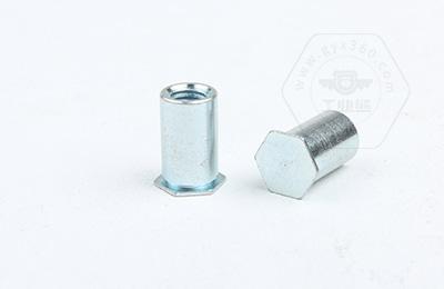 通過壓力機將六角頭壓入薄板的預置孔內(預置孔的孔徑一般略大于壓鉚螺柱的圓柱外徑)使孔的周邊產生塑性變形,變形部分被擠入壓鉚螺母柱的退刀槽內,使壓鉚螺母柱鉚緊于薄板上,從而在薄板上形成一下有效固定的內螺紋。